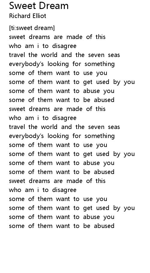 Sweet Dreams Lyrics Meaning / Showing search results for sweet dreams sorted by relevance.. Sweet dreams are made of these who am i to disagree? Some of them want to use you some of them want to get used by you some of them want to abuse you some of them want to be abused. Perhaps its because while changing the tone of the song you are able to see that the lyrics are somewhat disturbing. Sweet dreams are made of this who am i to disagree? I mention you when i say my prayers i wrap you around all of my thoughts boy you're my temporary high.
